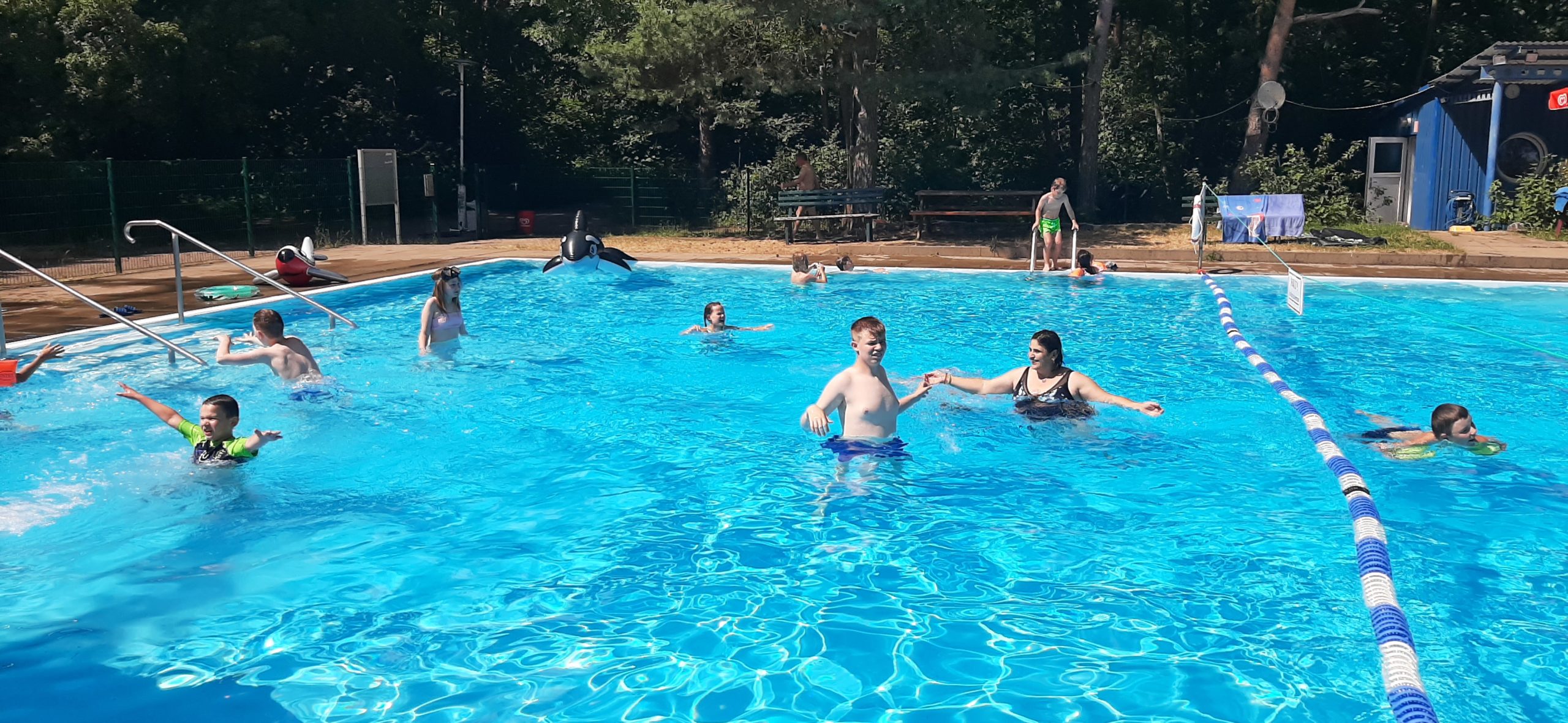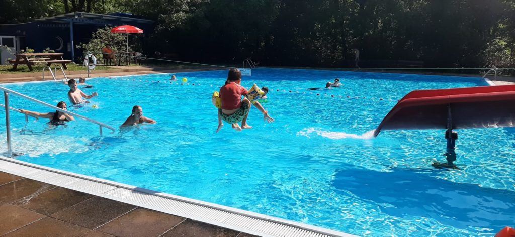 Nach einer eineinhalbstündigen Fahrt sind wir heute gut mit 38 Kindern und 21 Betreuern im KIEZ Feuerkuppe in Straußberg angekommen. Bei fantastischen Wetter bezogen wir unsere Bungalows und nutzen den Nachmittag für einen Sprung ins kühle Nass.