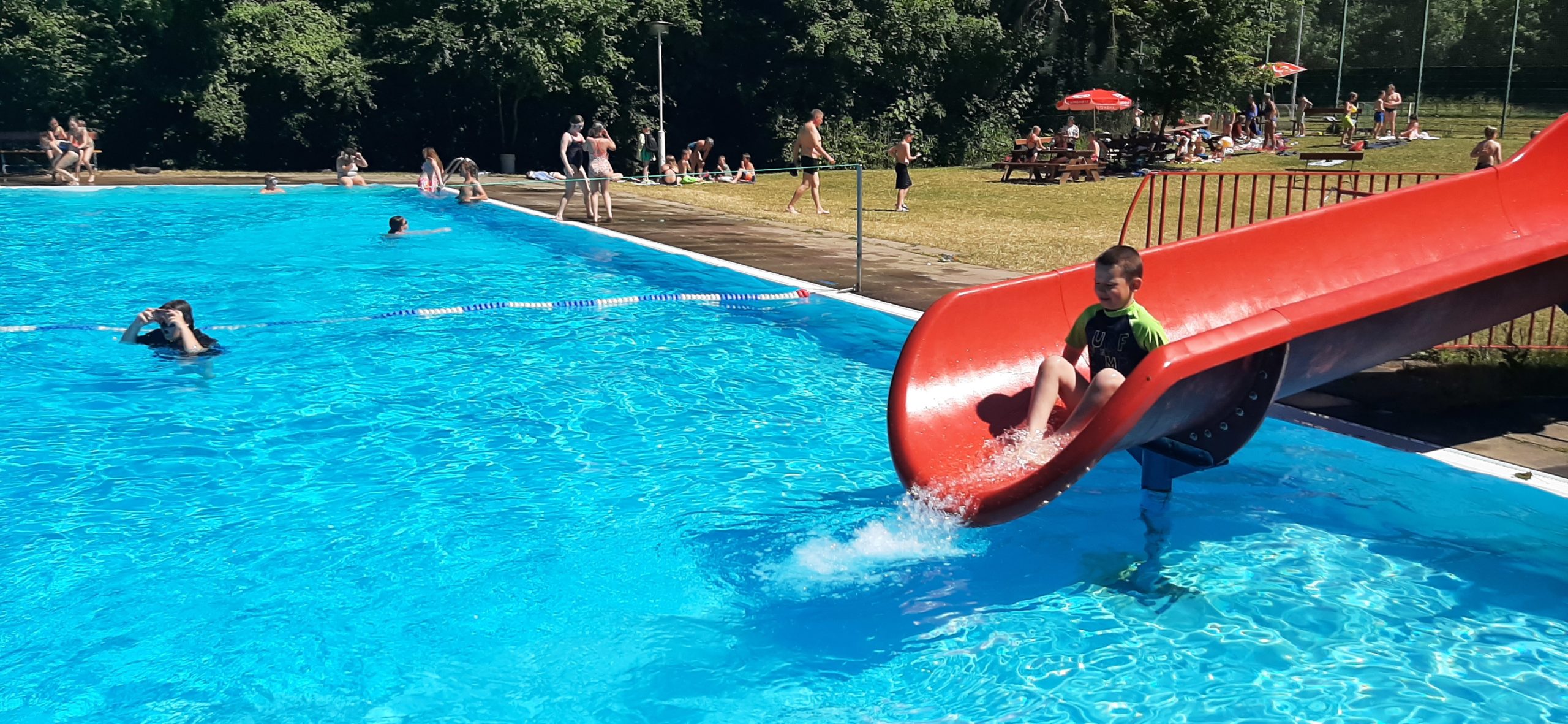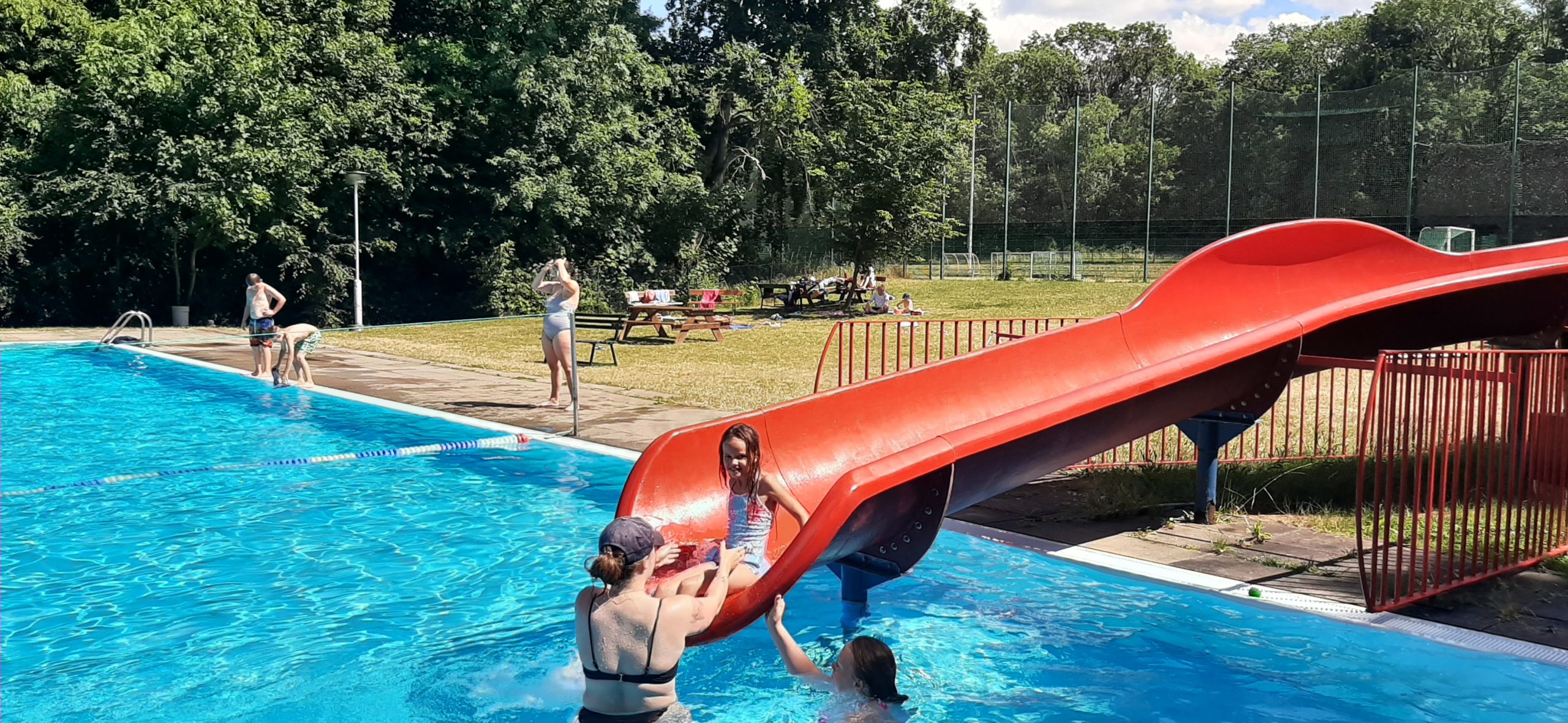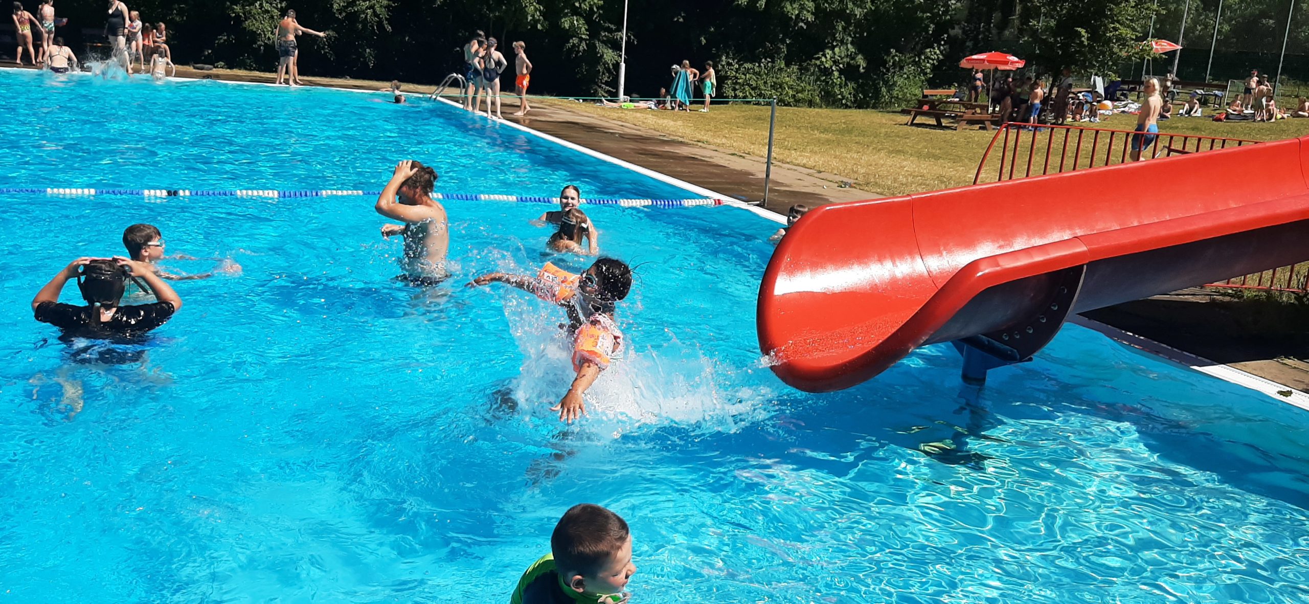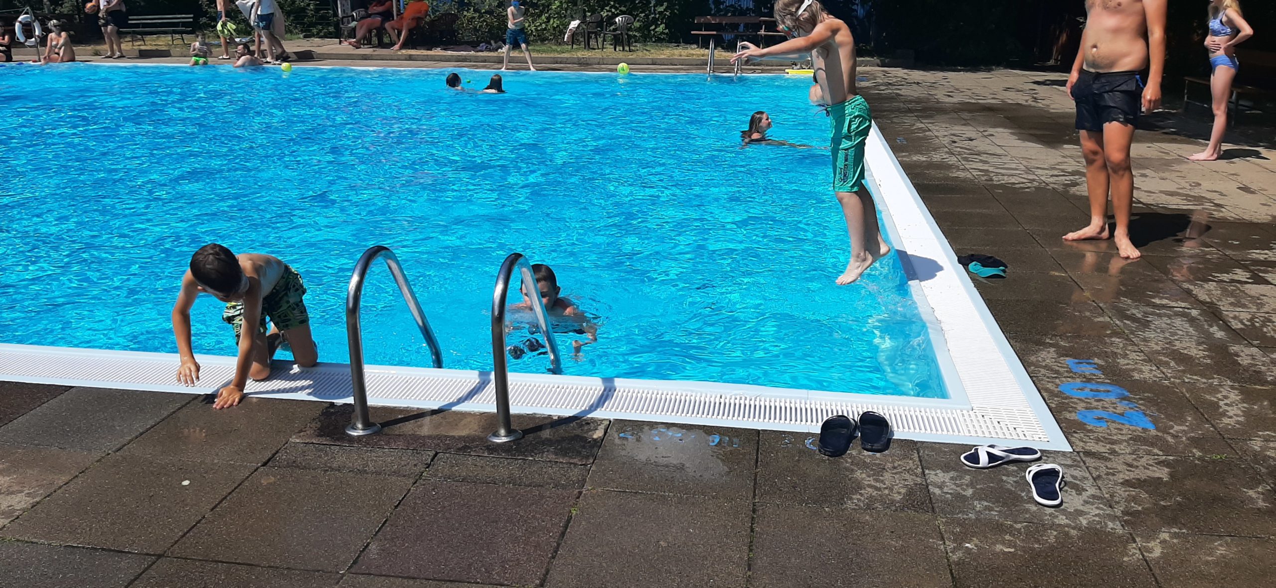 Nun liegt ein weiterer ereignisreicher und spannender Tag im KIEZ Feuerkuppe hinter uns. Während ein Teil der Kinder heute gemeinsam mit den Betreuern den Affenwald in Straußberg besucht hat und dabei allerhand interessante Dinge über die Haltung und Lebensweise dieser niedlichen Tiere erfahren konnte, haben alle anderen Kinder und Betreuer bei hochsommerlichen Temperaturen im Freibad eine kleine Abkühlung gefunden. Dabei wollten alle wissen, wer am schnellsten rutscht, am höchsten singt und am längsten die Luft anhalten kann.